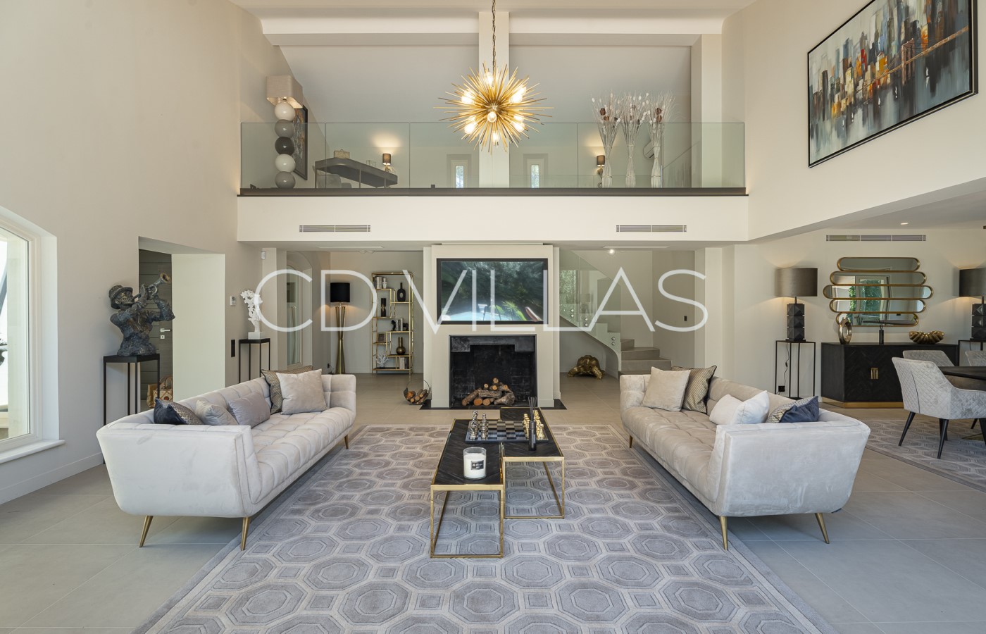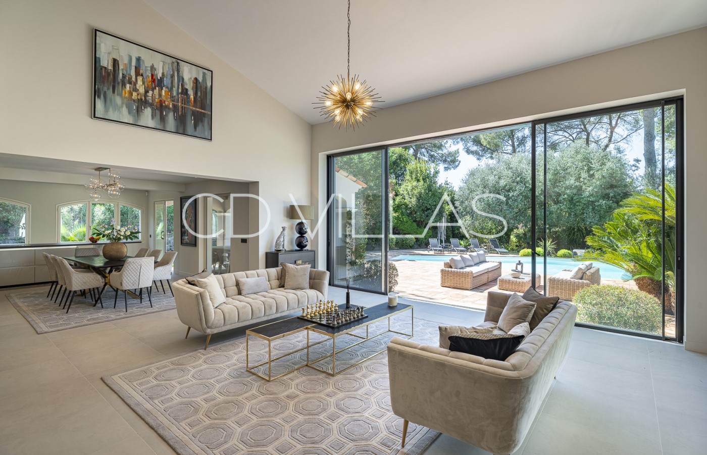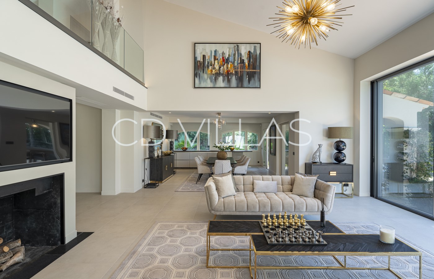 Séjour - Vaste séjour/salle à manger avec baies vitrées du sol au plafond, magnifique mezzanine surplombant les espaces de vie. Accès direct à la piscine et aux jardins.