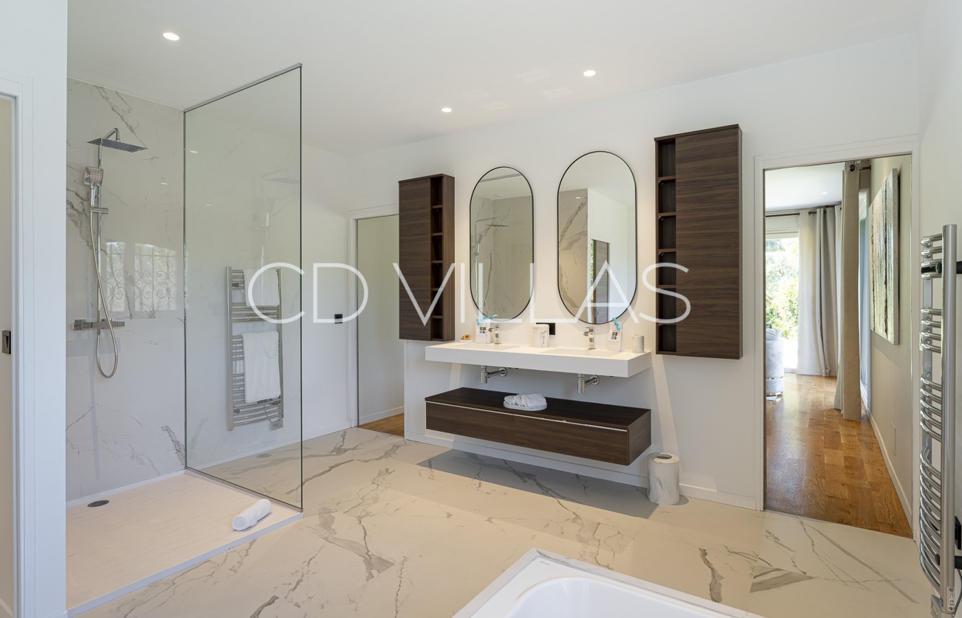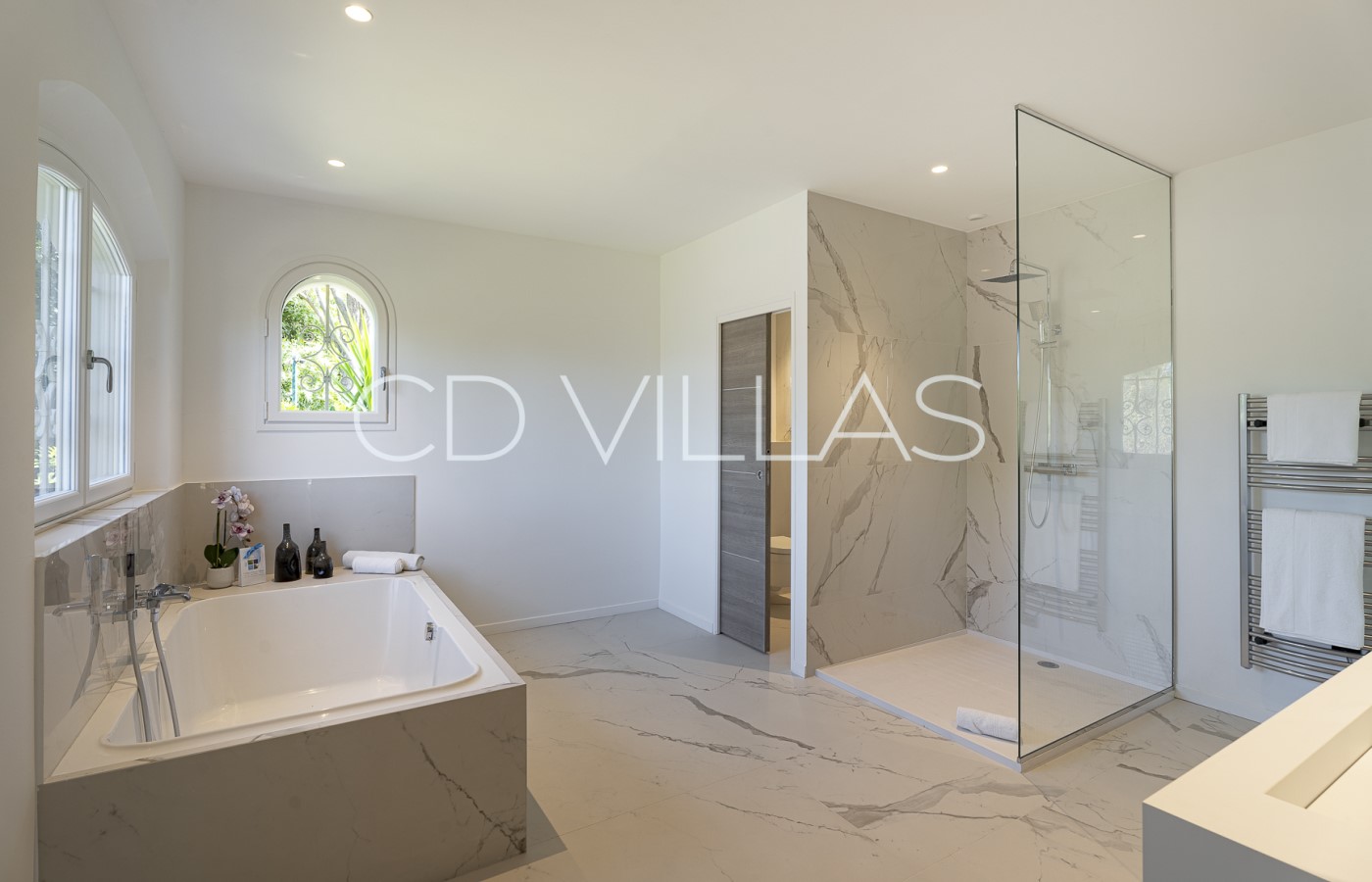 Chambre 1 - Suite parentale avec salle de bains attenante équipée d'une baignoire, d'une douche et de toilettes. Grande baie vitrée donnant sur le jardin et grand dressing.