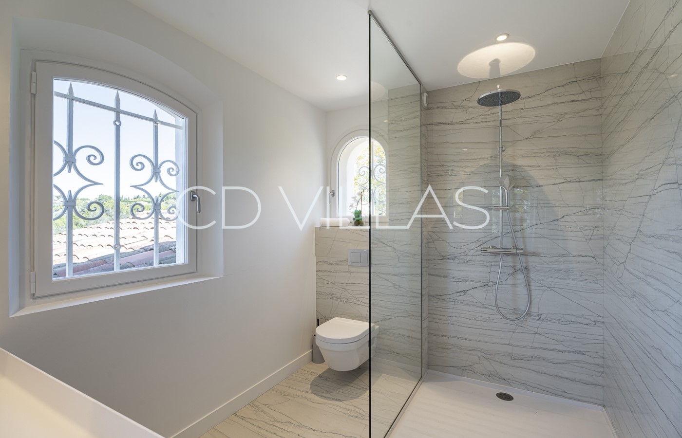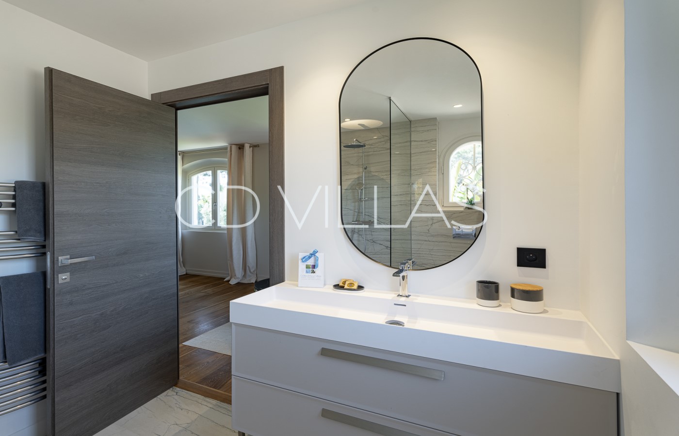 Chambre 4 - Grande chambre double avec salle de douche attenante équipée d'une douche, d'un lavabo et de toilettes. Cette chambre offre une vue magnifique sur le vieux village de Mougins.