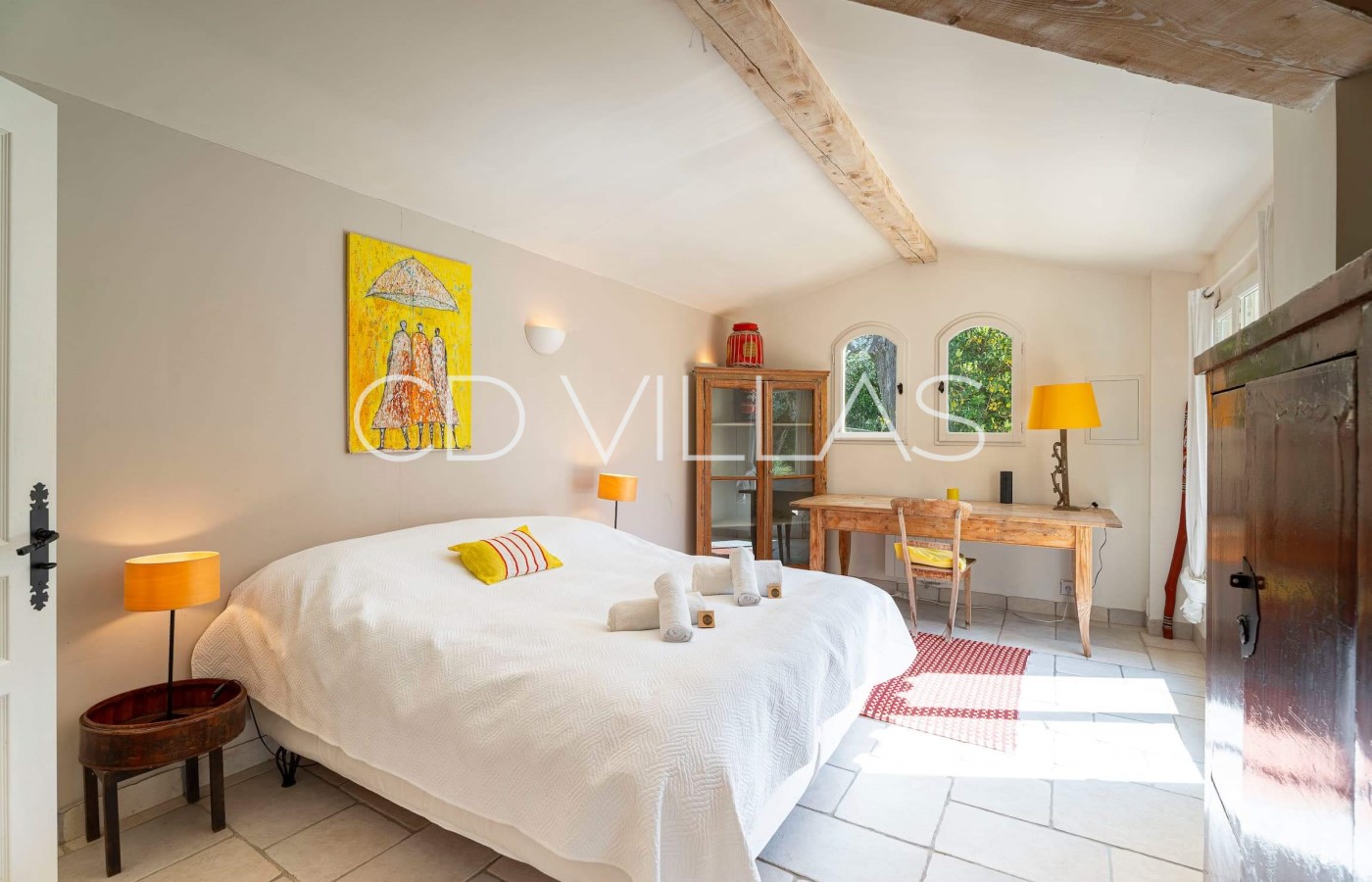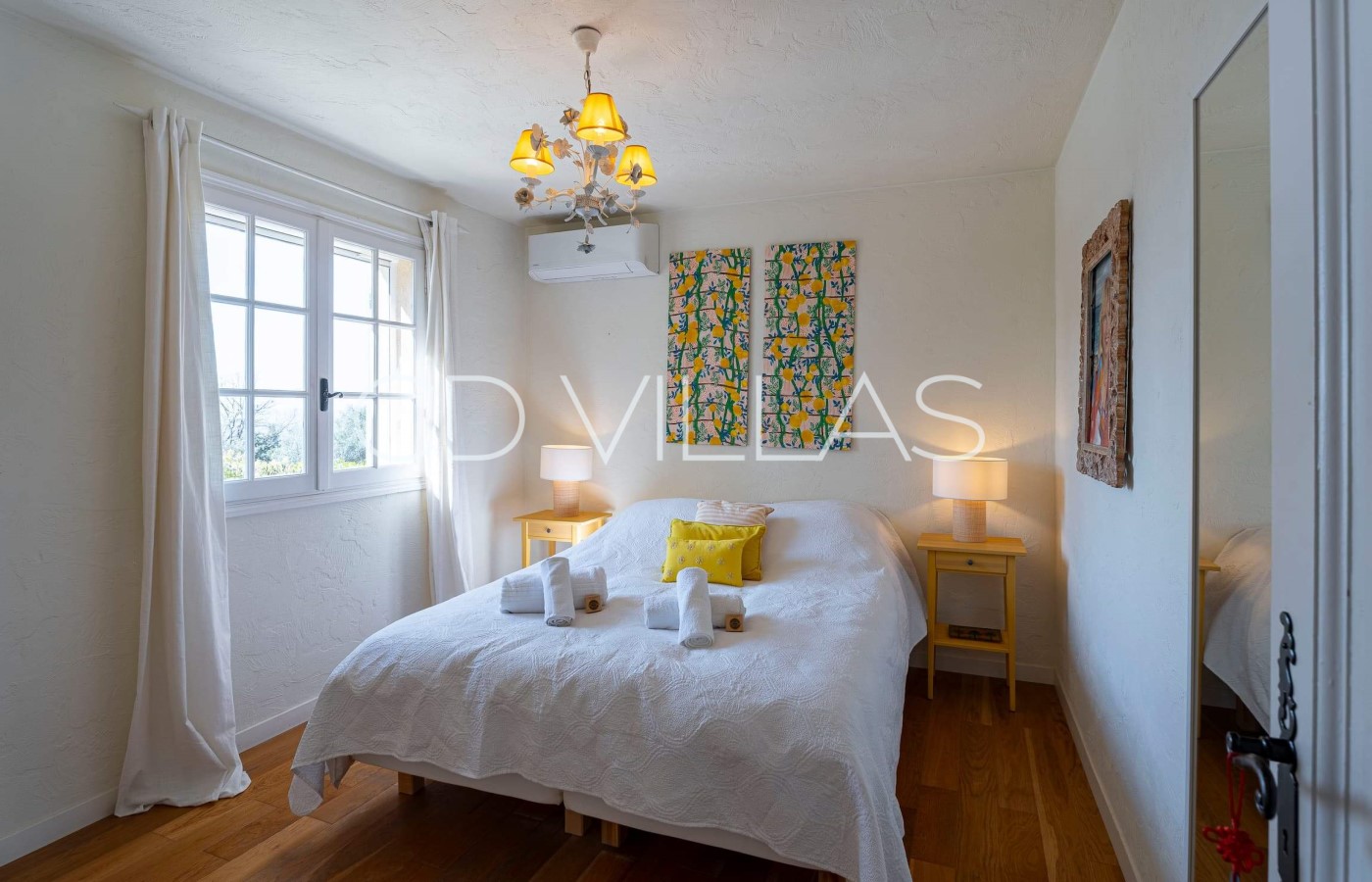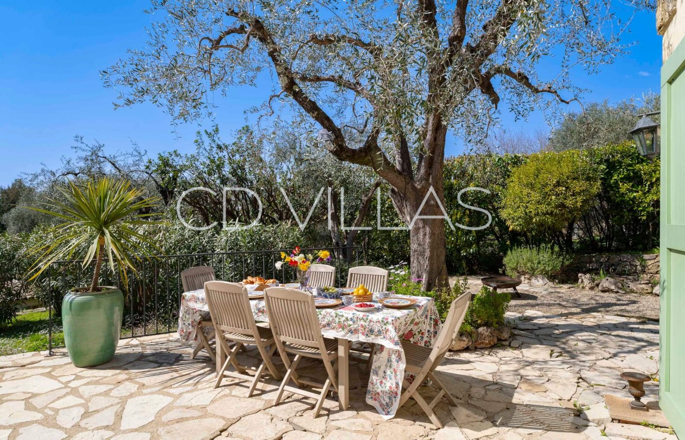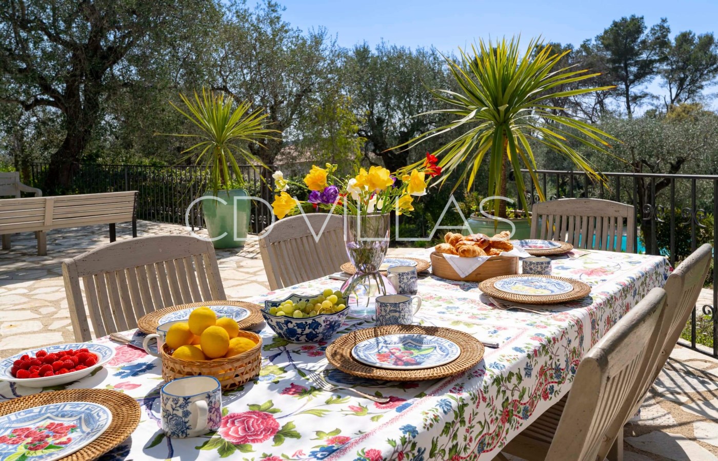 La maison a été magnifiquement rénovée et décorée en 2015 dans un style provençal moderne pour offrir un salon spacieux et lumineux, une cuisine, une salle à manger avec un coin télévision et un bureau adjacents. Il y a 5 chambres au total - quatre dans la maison principale et un appartement séparé au bord de la piscine avec sa propre cuisine. Les chambres à l'étage ouvrent sur un balcon privé donnant sur les collines d'Opio avec un aperçu mer en arrière-plan. En bas, le salon et la cuisine donnent sur une grande terrasse ensoleillée avec une table à manger pour 10 personnes, un barbecue et un coin salon.