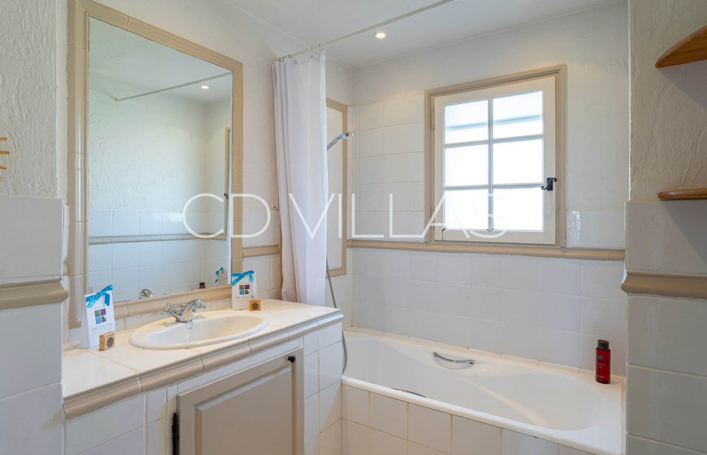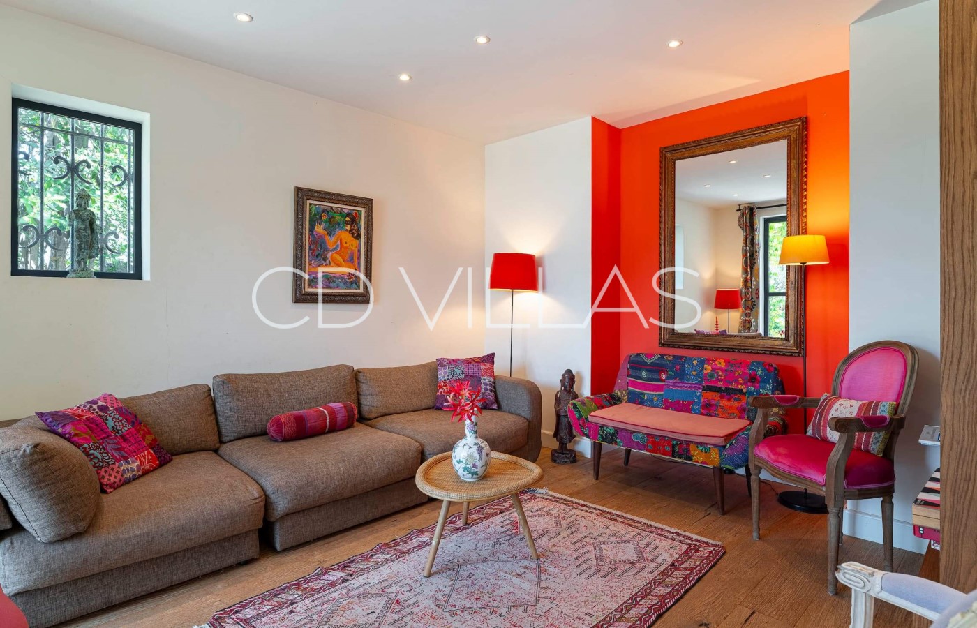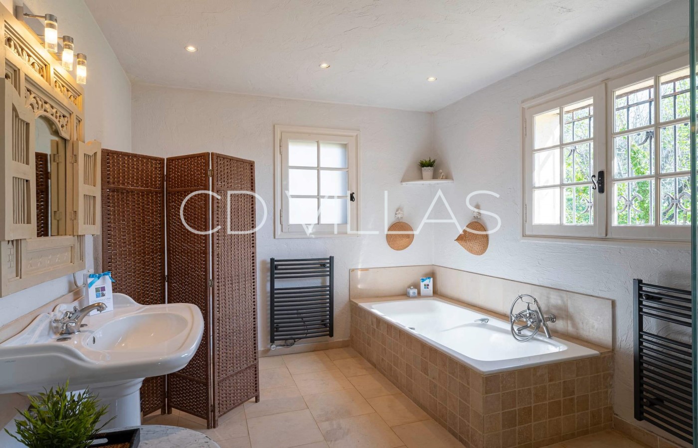 La villa est implantée dans un jardin méditerranéen luxuriant planté de palmiers, d'oliviers et d'arbustes à fleurs et de nombreuses pelouses parfaites pour les enfants. La piscine est à l'écart de la maison principale, offrant à la fois intimité et sécurité. À côté de la piscine se trouvent une grande terrase et une salle à manger extérieure couverte avec une table à manger pour 10 personnes. Le jardin est clos et accessible par un portail en fer forgé. Il y a un parking sur place pour 4 voitures.