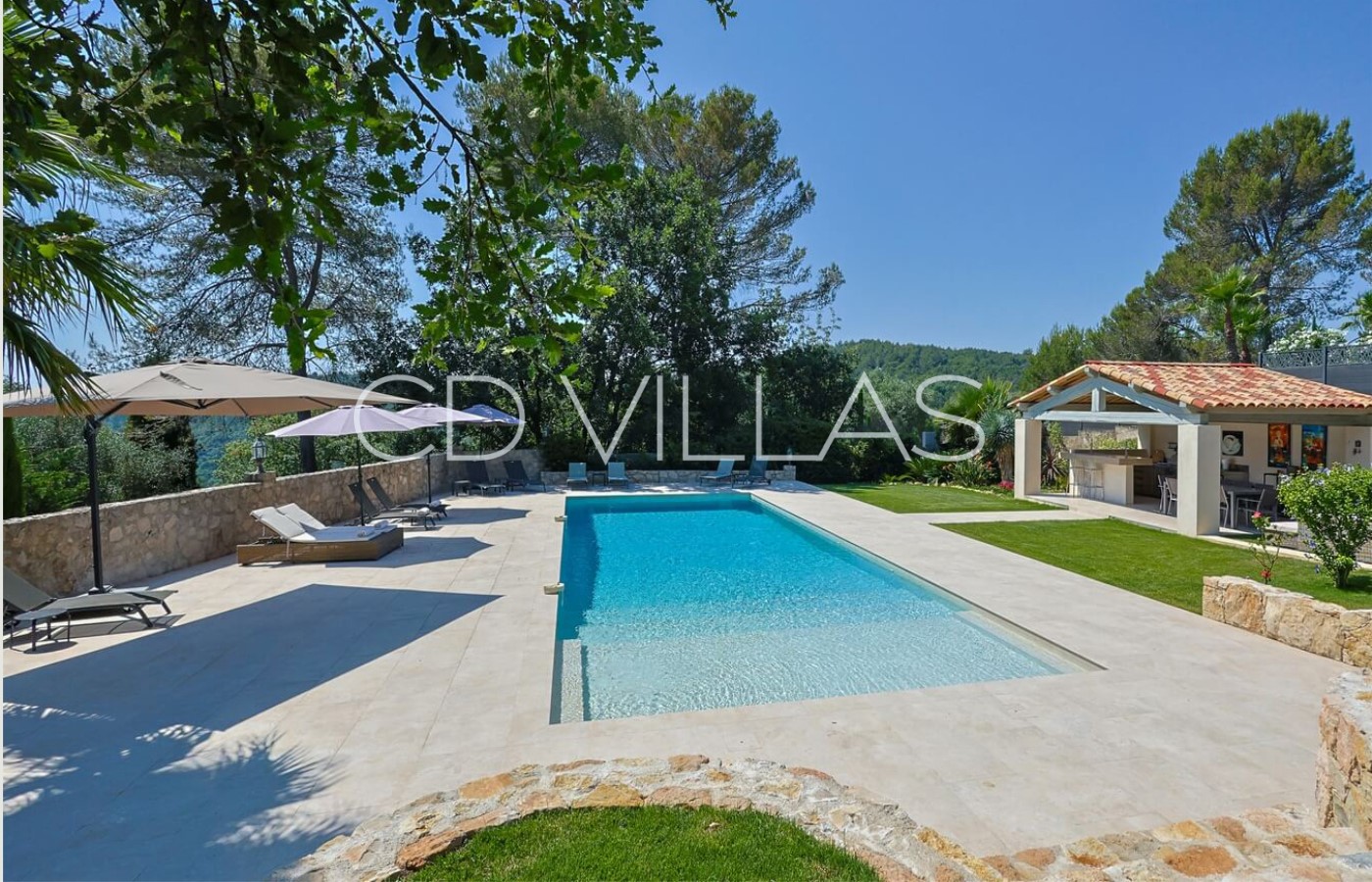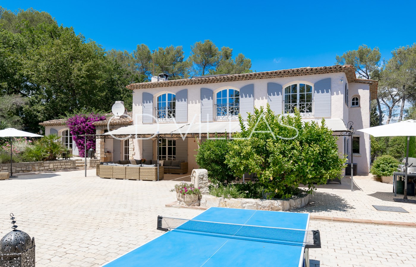 La propriété est située dans un joli jardin de 5000 m², et dispose à l'extérieur, d'un barbecue familial, d'une immense table à manger, de plusieurs salons de jardin, de grandes pelouses et une oliveraie. De l'autre coté de la pelouse se trouve une grande terrasse abritée avec piscine de 12m x 6m avec différentes profondeurs. La maison dispose aussi d'une table de ping-pong et d'un terrain de pétanque.