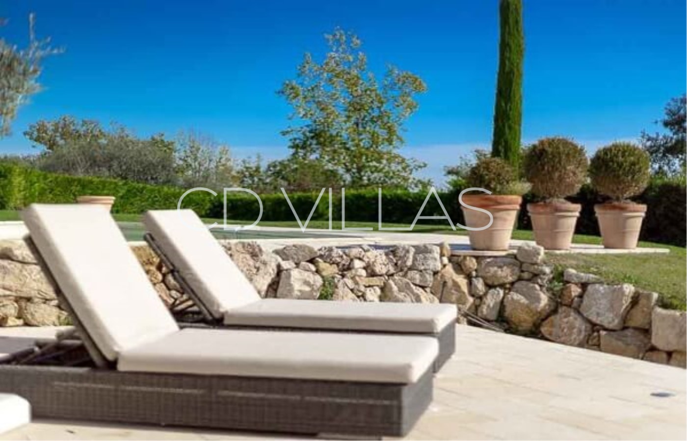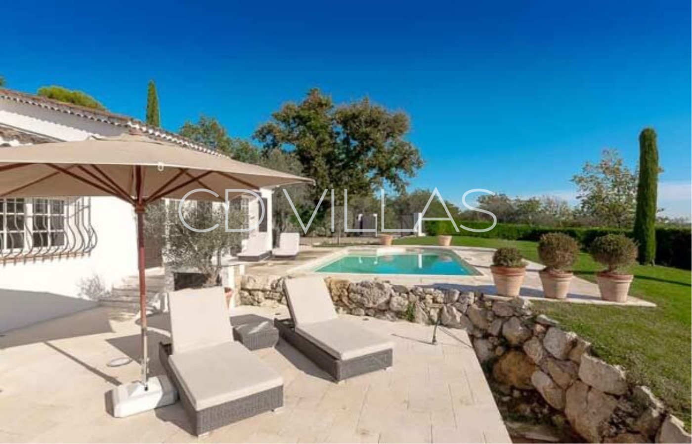 La villa est implantée dans un beau jardin avec pelouse, piscine privée et un grande terrasse ensoleillée de 80m2 avec de nombreux transats. Depuis le jardin vous pourrez profiter d'une belle vue sur les montagnes et les oliveraies environnantes.