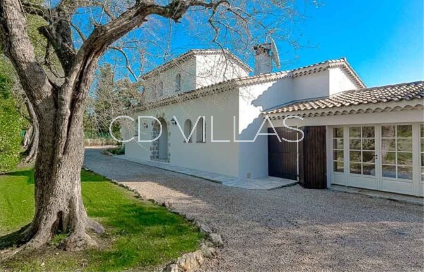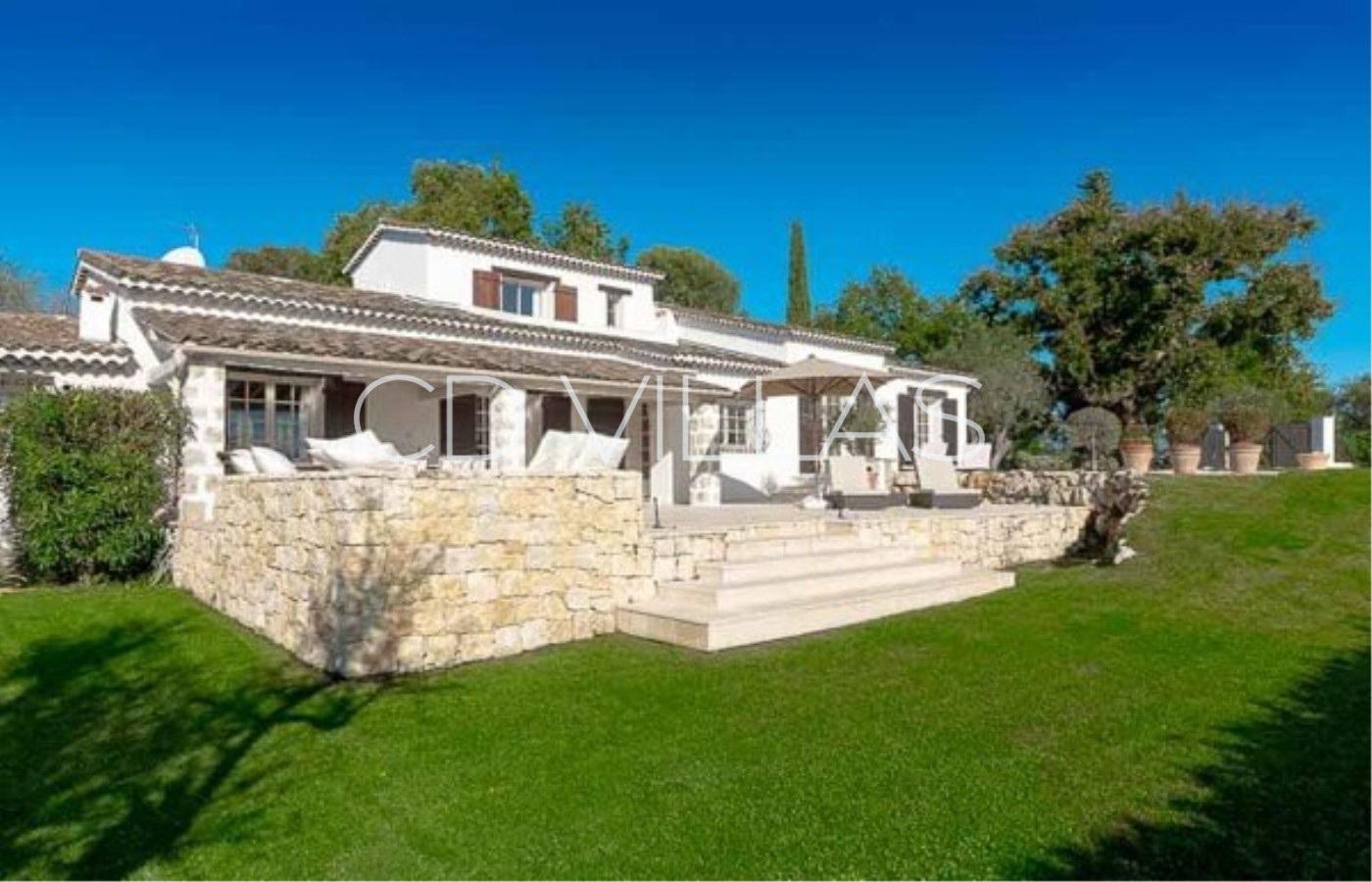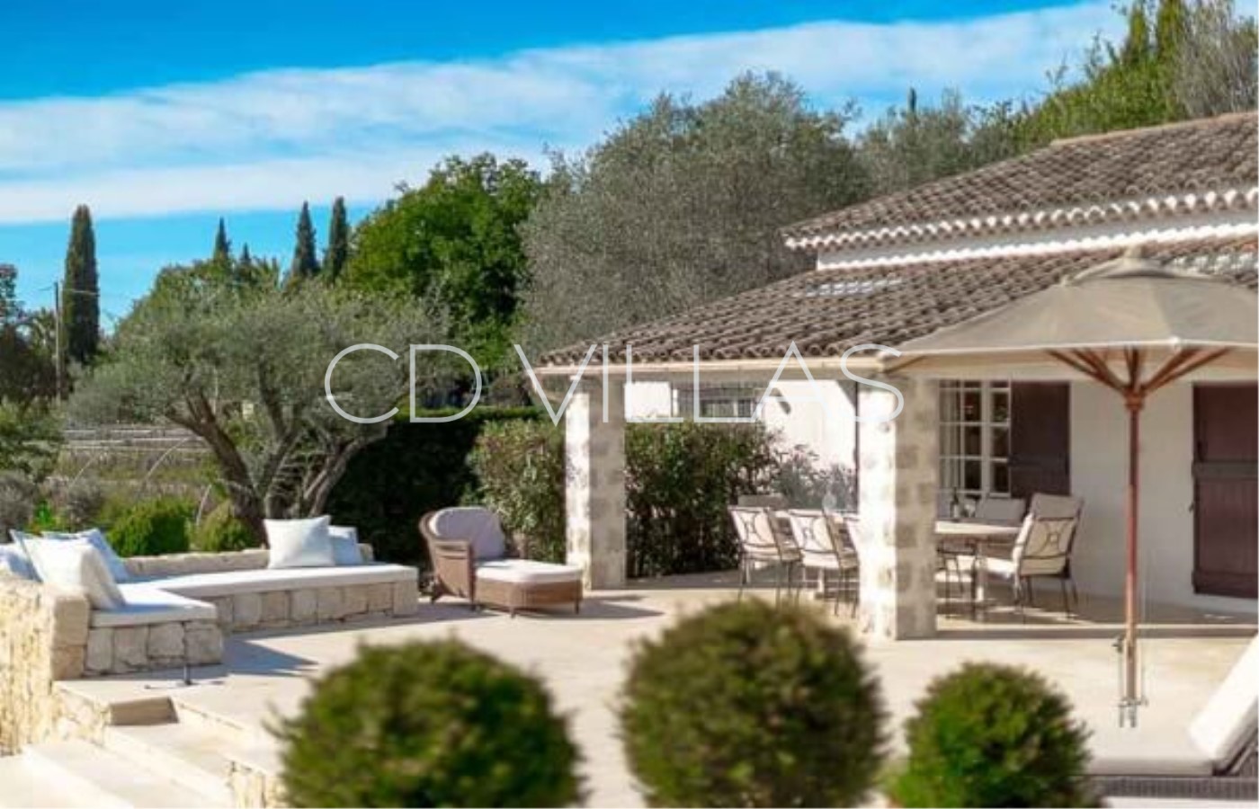 La villa est située au bout d'une voie sans issue au cœur d'un quartier résidentiel paisible à seulement 15 minutes de marche du charmant village de Valbonne.